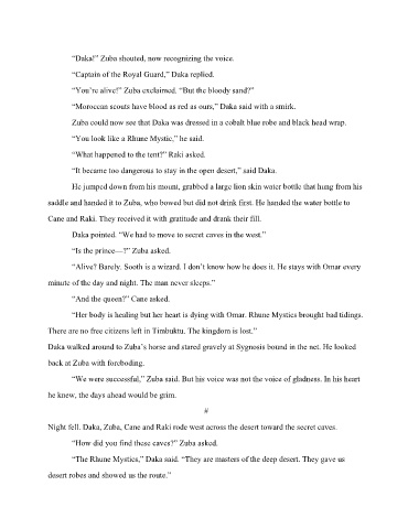 Night fell. Daka, Zuba, Cane and Raki rode west across the desert toward the secret caves.