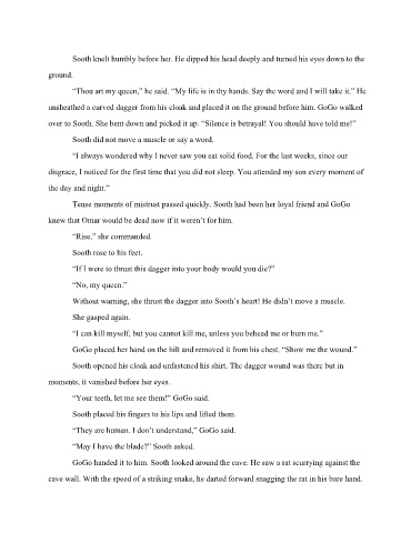 Sooth knelt humbly before her. He dipped his head deeply and turned his eyes down to the