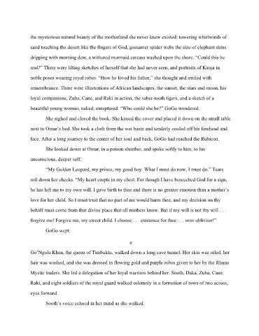 Go’Ngola Khan, the queen of Timbuktu, walked down a long cave tunnel. Her skin was oiled, her